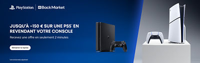 * Offre de coupon valide uniquement pour les packs/consoles PS5, PS5 Pro et PS VR2 achetés sur https://direct.playstation.com/. Non utilisable sur les précommandes ou en combinaison avec d'autres offres. Les coupons expirent à la date indiquée sur l'email auquel ils sont joints. Veuillez vous référer à la liste des coupons dans la FAQ pour confirmer l'information. Sauf mention contraire, les coupons doivent être utilisés avant le 30/11/25 à 23 h 59, heure de Paris. Un coupon par personne uniquement. Les coupons ne peuvent être utilisés par leur destinataire qu'une seule fois, et cette offre est réservée aux résidents d'Espagne et d'Allemagne. La revente d'une PS4™ doit être initiée sur https://direct.playstation.com/fr-fr/trade-in-and-trade-up, et la PS4™ doit être expédiée au service de rénovation de Back Market avant la date spécifiée pour pouvoir bénéficier du coupon de réduction de 50 €. Le coupon de 50 € sera envoyé par Back Market une fois la revente finalisée. L'offre est susceptible d'être modifiée ou annulée à tout moment, et ni substitution ni coupon de remplacement ne seront offerts. L'offre est aussi soumise aux Conditions d'utilisation de revente de Back Market, qui sont disponibles à cette adresse :